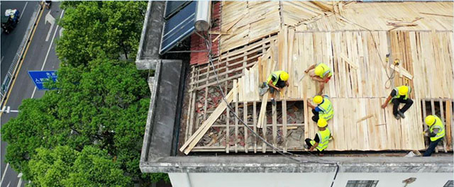 在財富大廈施工現(xiàn)場,已經(jīng)從事建筑行業(yè)多年的鄧康,正和工友們在8樓高的頂樓進行屋頂改造施工。這處施工面積有600余平方米的屋頂上,老舊瓦片已經(jīng)被去除,工人們正在忙碌,“這幾天天氣好,沒有下雨,我們要趕緊把架子搭好,鋪上油毛氈,釘上順水條、掛瓦條,把樹脂瓦鋪上去?!?/p>
