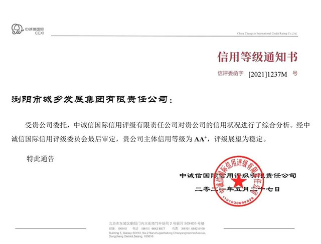 5月31日,經(jīng)國內(nèi)權(quán)威信用評(píng)級(jí)機(jī)構(gòu)中誠信國際評(píng)定,瀏發(fā)集團(tuán)獲評(píng)主體信用等級(jí)“AA+”,評(píng)級(jí)展望為“穩(wěn)定”,實(shí)現(xiàn)了瀏陽國有企業(yè)在信用評(píng)級(jí)上的又一重大突破,具有里程碑意義。