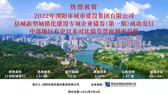 3月1日,瀏發(fā)集團(tuán)子公司瀏陽(yáng)城建集團(tuán)2022年縣城新型城鎮(zhèn)化建設(shè)專項(xiàng)企業(yè)債券(第一期)成功發(fā)行,發(fā)行規(guī)模7億元,期限5+2年,發(fā)行利率3.87%,創(chuàng)中部地區(qū)有史以來可比債券最低利率。