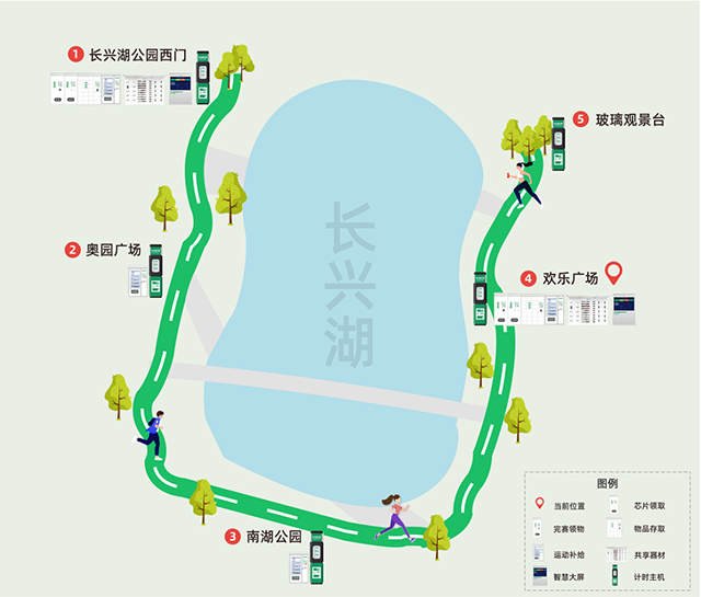 長興湖健康主題公園智慧跑道融合了5G、大數(shù)據(jù)、物聯(lián)網(wǎng)、云計算等智慧技術(shù),沿途設(shè)置了5個智能計時點,每間隔500米一個,可自動記錄運動數(shù)據(jù)。其中2個為綜合服務(wù)點,可為運動者提供計時打卡、運動芯片領(lǐng)取、隨身物品存取、紀(jì)念品領(lǐng)取、運動器材租賃、運動飲品購買等多項體驗。