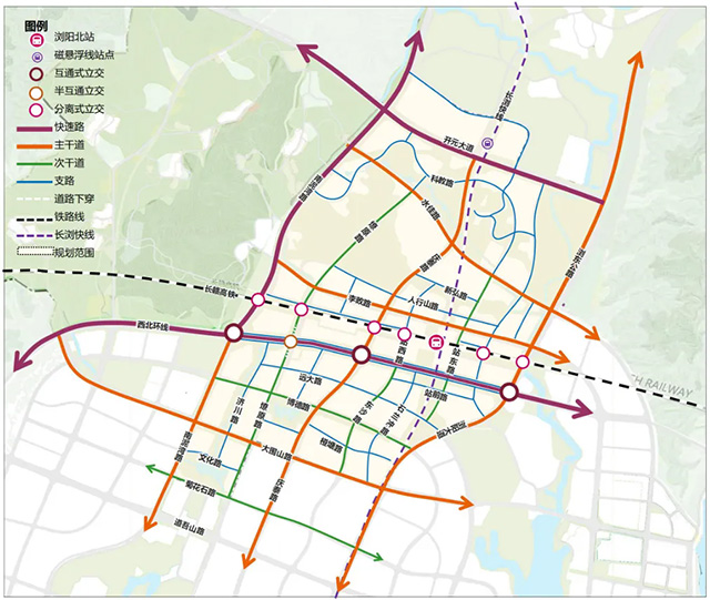 片區(qū)規(guī)劃構(gòu)建起“五橫三縱”主干路網(wǎng)體系(五橫:開元大道、水佳北路、李畋路、西北環(huán)線、大圍山路;三縱:南泥灣路、慶泰路、瀏東公路-瀏陽大道),有效連接高鐵樞紐,暢通片區(qū)內(nèi)外聯(lián)系。