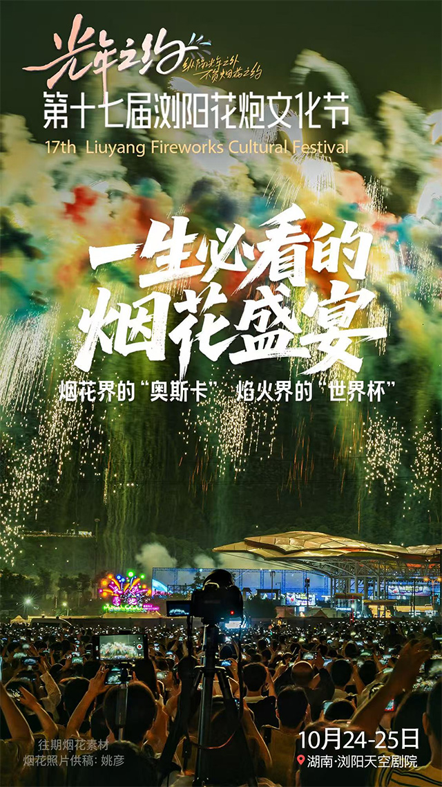 第十七屆瀏陽花炮文化節(jié)定檔10月24日-25日,將以“光年之約”為主題,突出國際范、科技感和文化味,創(chuàng)新推出六大主體活動,演繹寶藏級的千年文化,點(diǎn)亮百億級的富民產(chǎn)業(yè),綻放現(xiàn)象級的焰火經(jīng)濟(jì)。