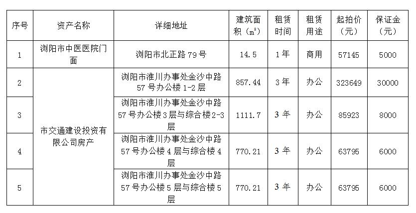 受瀏陽市中醫(yī)醫(yī)院和瀏陽市交通建設(shè)投資有限公司等單位委托,根據(jù)國有資產(chǎn)管理的相關(guān)規(guī)定,我公司定于2021年1月28日下午14:00在瀏陽市城鄉(xiāng)發(fā)展集團(tuán)有限責(zé)任公司8樓會(huì)議室,對(duì)位于瀏陽市北正路、金沙中路57號(hào)等5處資產(chǎn)面向社會(huì)進(jìn)行公開拍租。