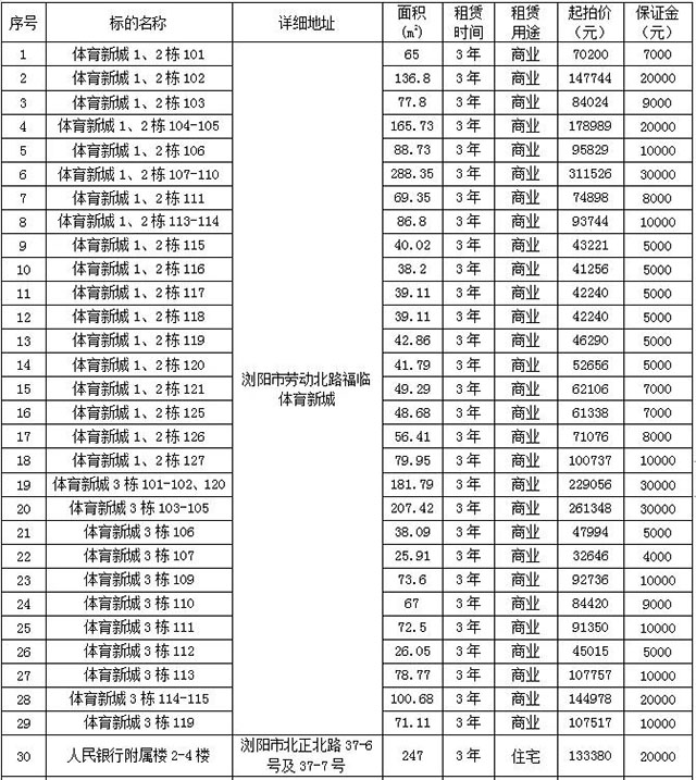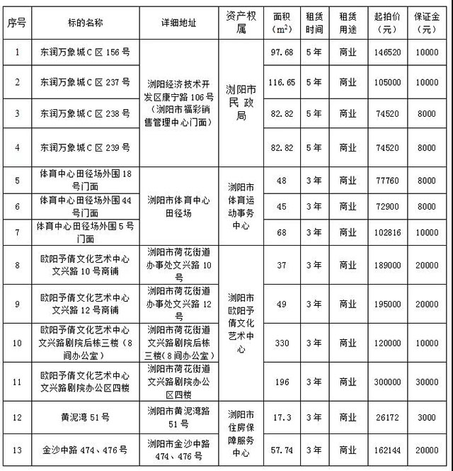 受瀏陽市民政局、瀏陽市體育運動事務(wù)中心、瀏陽市歐陽予倩文化藝術(shù)中心和瀏陽市住房保障服務(wù)中心委托,根據(jù)國有資產(chǎn)管理的相關(guān)規(guī)定,我公司定于2021年7月28日上午10:00在瀏陽市城鄉(xiāng)發(fā)展集團(tuán)有限責(zé)任公司8樓會議室(人民東路60號),對下列標(biāo)的面向社會進(jìn)行公開拍租,標(biāo)的情況見下表: