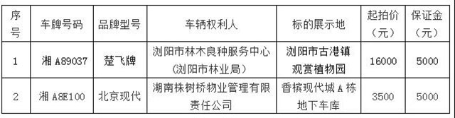 受瀏陽市林木良種服務(wù)中心和湖南株樹橋物業(yè)管理有限責(zé)任公司委托,根據(jù)國有資產(chǎn)管理的相關(guān)規(guī)定,我公司定于2021年7月27日上午10:00在瀏陽市城鄉(xiāng)發(fā)展集團(tuán)有限責(zé)任公司8樓會議室,對兩臺車輛面向社會進(jìn)行公開拍賣。拍賣標(biāo)的如下: