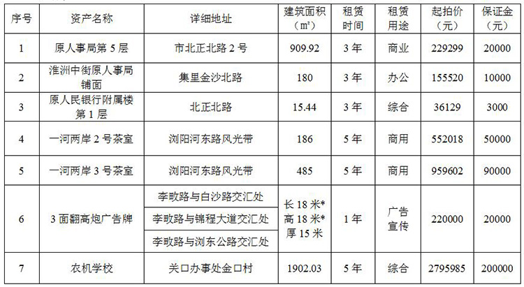 受瀏陽(yáng)市城鄉(xiāng)發(fā)展集團(tuán)有限責(zé)任公司和瀏陽(yáng)市農(nóng)業(yè)農(nóng)村局等單位委托,根據(jù)國(guó)有資產(chǎn)管理的相關(guān)規(guī)定,我司定于2020年12月4日上午10:00在瀏陽(yáng)市城鄉(xiāng)發(fā)展集團(tuán)有限責(zé)任公司8樓會(huì)議室(人民東路60號(hào)),對(duì)位于瀏陽(yáng)市北正北路2號(hào)、瀏陽(yáng)河?xùn)|路風(fēng)光帶、瀏陽(yáng)市關(guān)口街道辦事處金口村農(nóng)機(jī)學(xué)校等7宗資產(chǎn)面向社會(huì)進(jìn)行公開(kāi)拍租,標(biāo)的情況見(jiàn)下表: