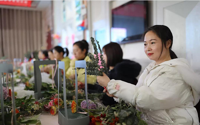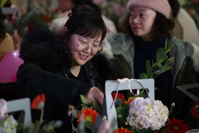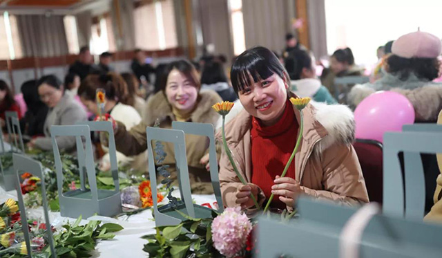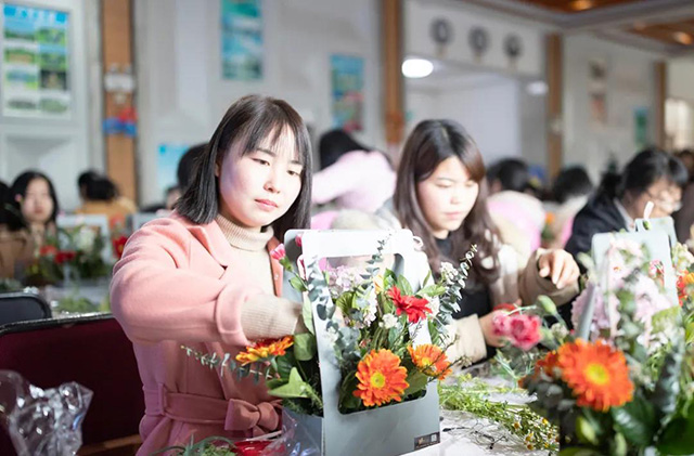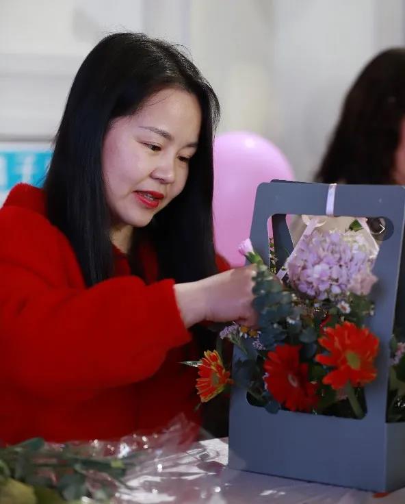 在專業(yè)花藝師的帶領下,女同胞們饒有興致地修枝剪葉,沉浸在花藝創(chuàng)作的浪漫氛圍中。