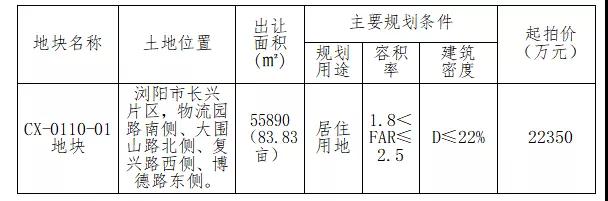 (瀏陽(yáng)長(zhǎng)興片區(qū),83.83畝,起拍價(jià)22350萬(wàn)元)