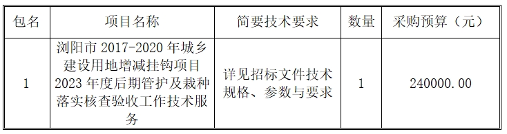 一、采購項目名稱:瀏陽市2017-2020年城鄉(xiāng)建設(shè)用地增減掛鉤項目2023年度后期管護及栽種落實核查驗收工作技術(shù)服務(wù)