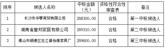 受瀏陽市水利建設(shè)投資有限公司的委托,湖南凱博項目管理有限公司對瀏陽市集里街道集里中學(xué)至善公租房項目家具采購進(jìn)行公開招標(biāo)采購,現(xiàn)將采購結(jié)果公告如下: